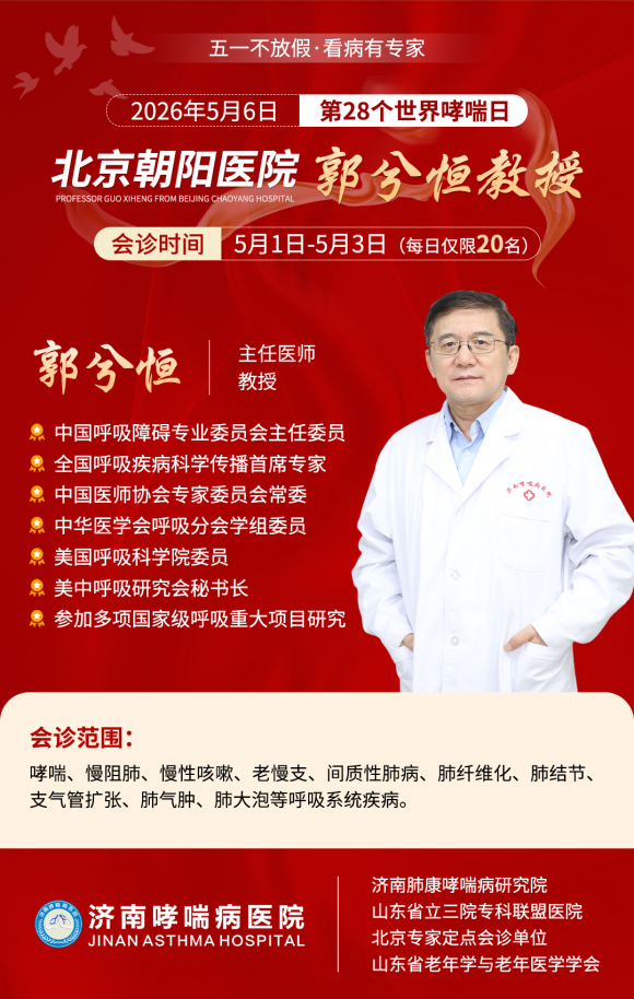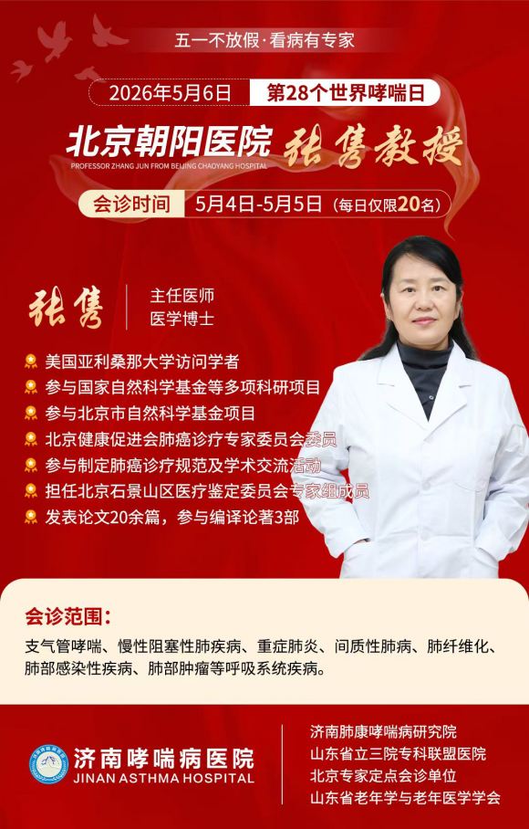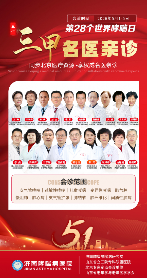 为积极响应世界哮喘日号召,让规范治疗惠及更多患者,五一假期期间,济南哮喘病医院特邀北京朝阳医院多位专家,举办专场公益义诊,以实际行动助力人人享有规范治疗。为了减轻患者家庭的就医负担,同时开展2026“红围巾哮喘、慢阻肺关爱行动”专项医疗公益援助活动,给予呼吸病医疗补贴(仅限活动期间),报名预约,还能够申请到呼吸病“0元筛查”专项援助,帮助更多哮喘、慢阻肺、老慢支、肺气肿、支气管扩张、间质性肺病、肺纤维化、肺结节等呼吸病患者早日康复。